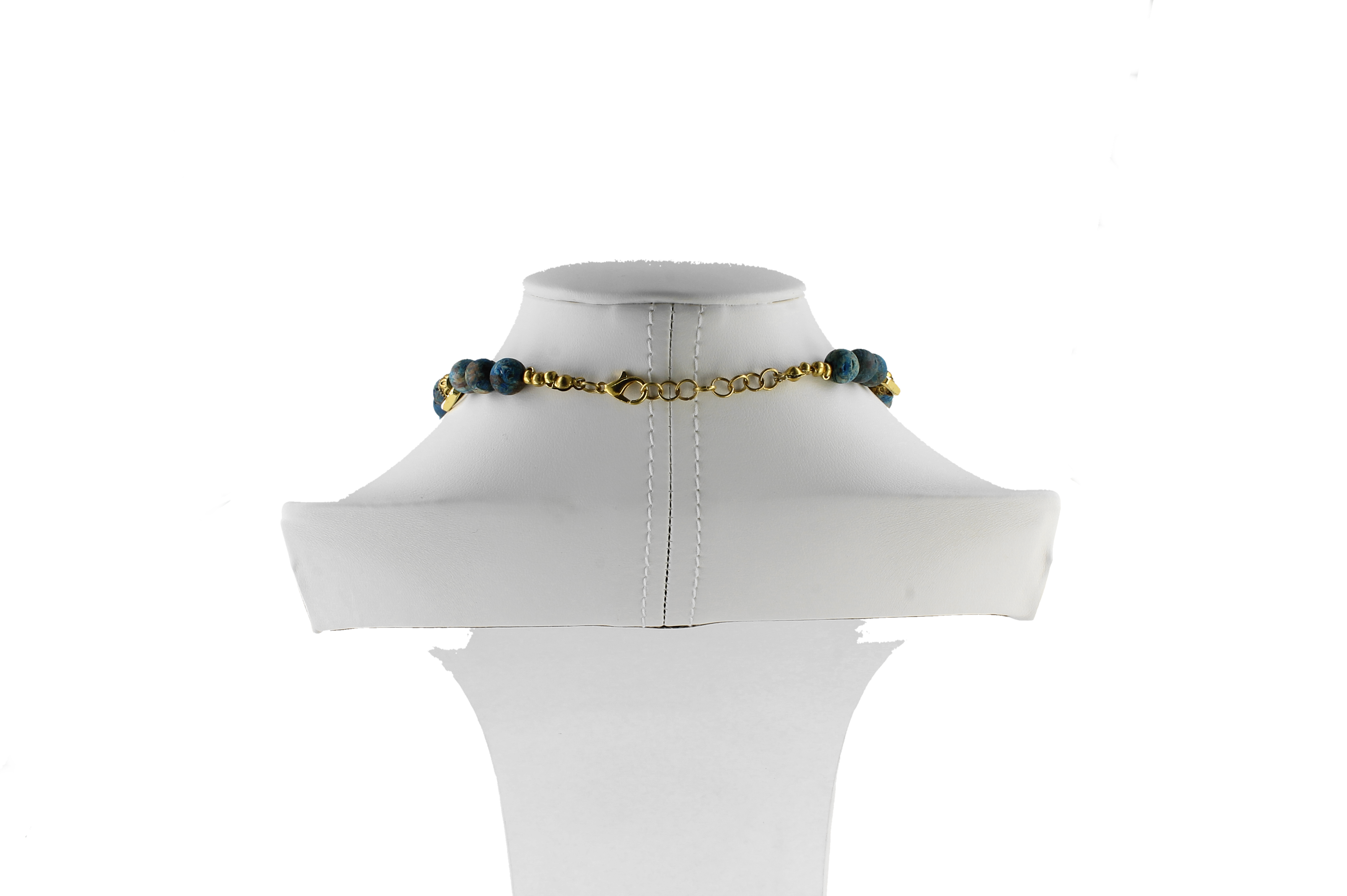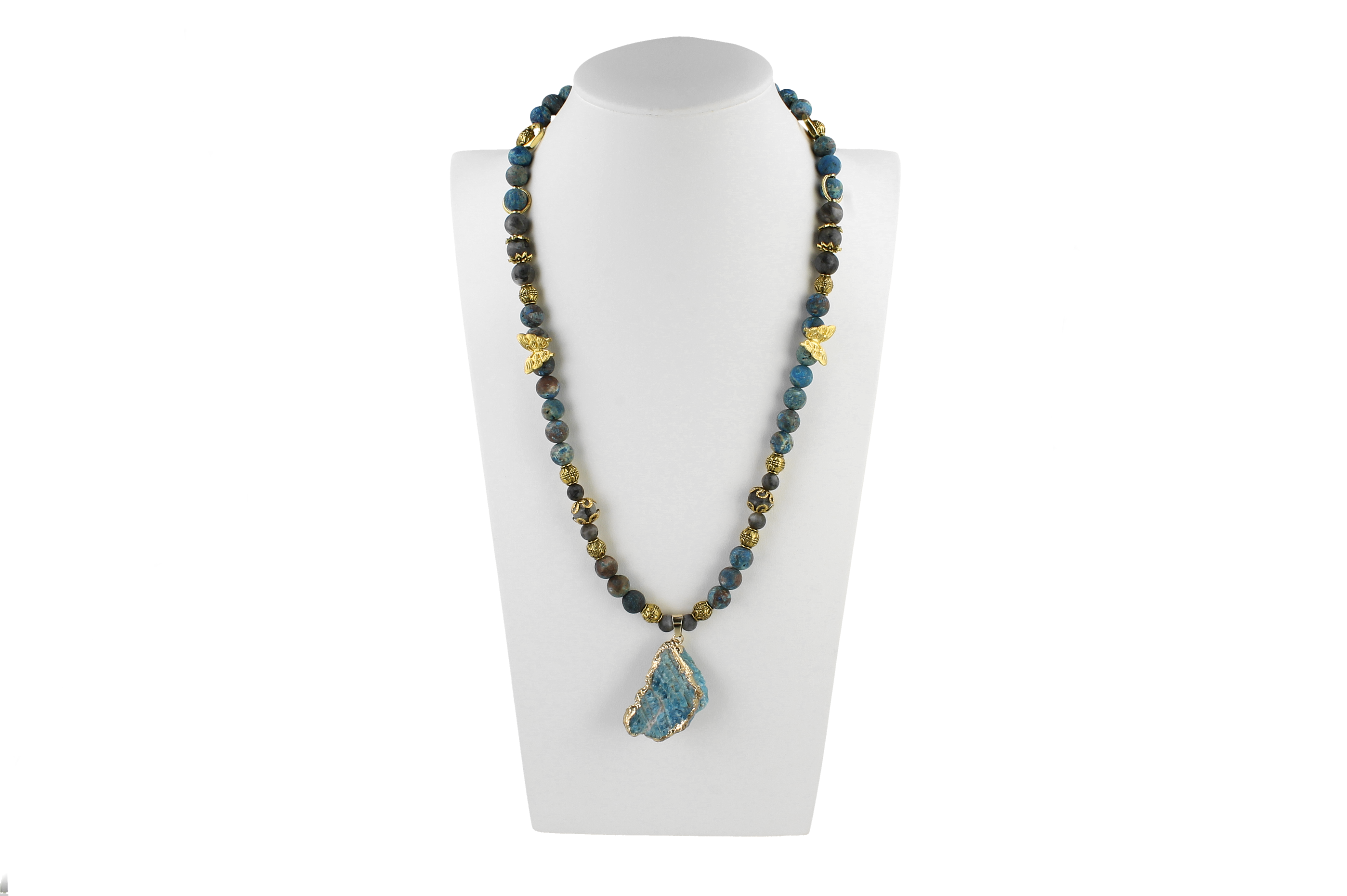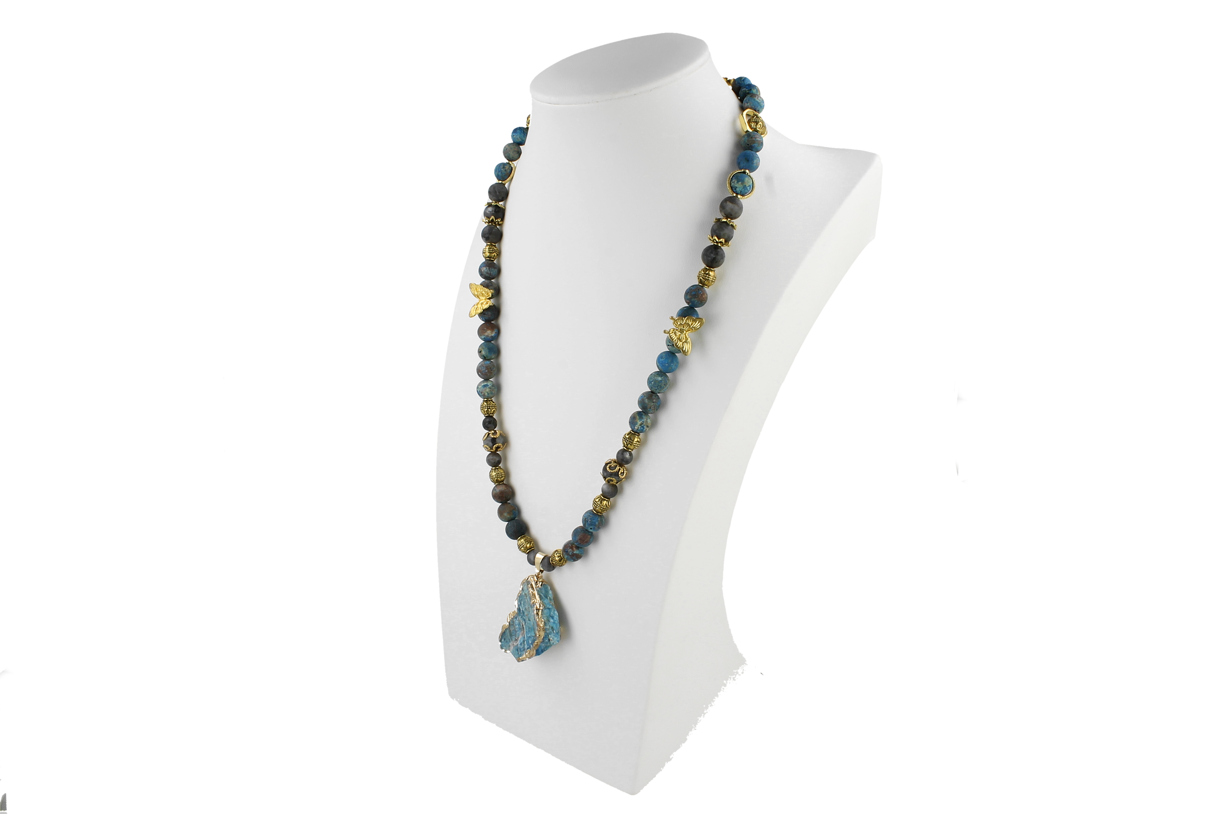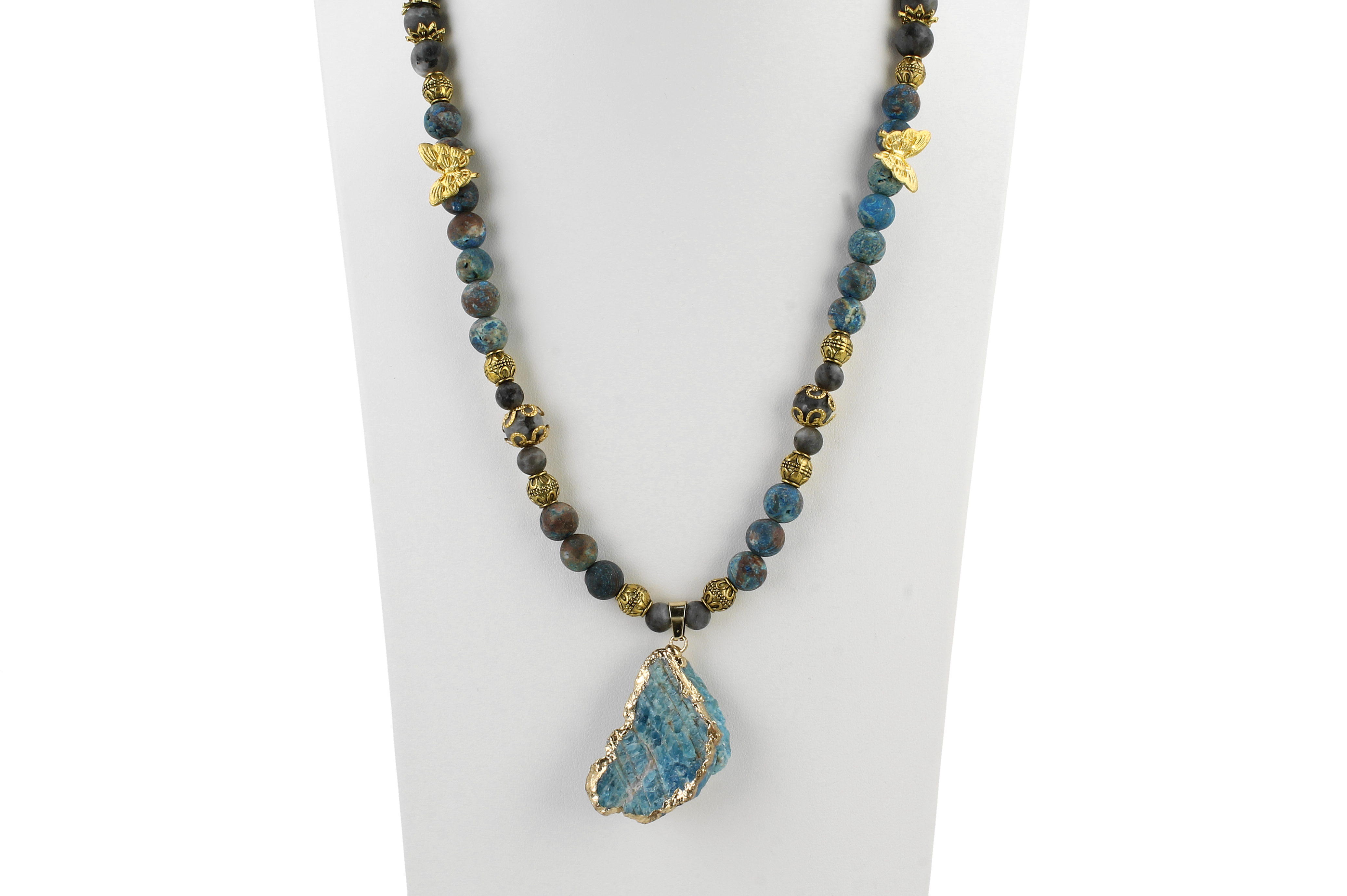 Wyjątkowy, ręcznie wykonany naszyjnik z kamieni naturalnych w odcieniach oceanu: turkusu i głębokiego błękitu. Centralnym elementem jest efektowna zawieszka – surowy kamień naturalny w oprawie w kolorze złota. Całość dopełniają ozdobne przekładki oraz urocze zawieszki pszczółki, które nadają biżuterii elegancki, ale też lekko magiczny charakter.