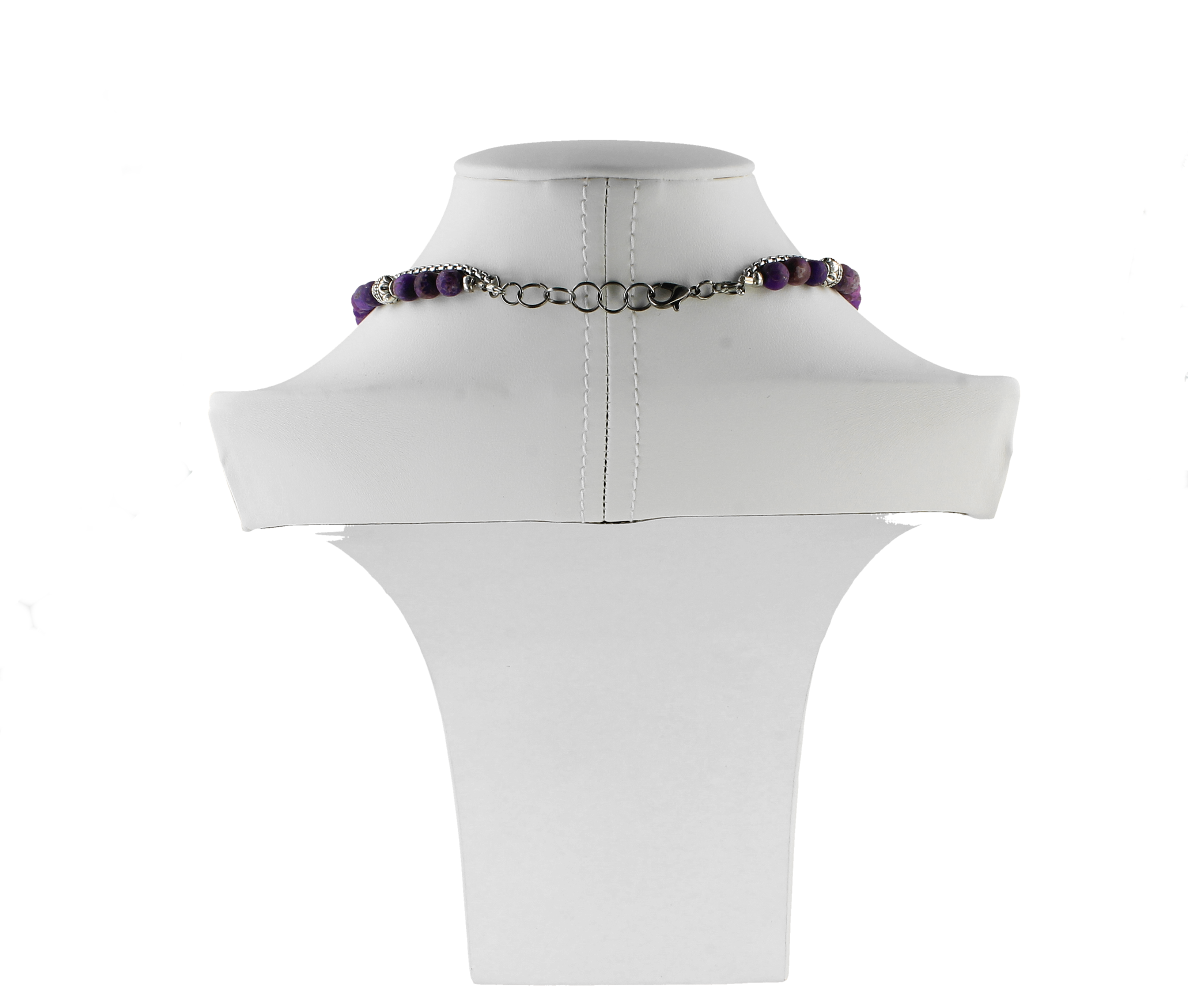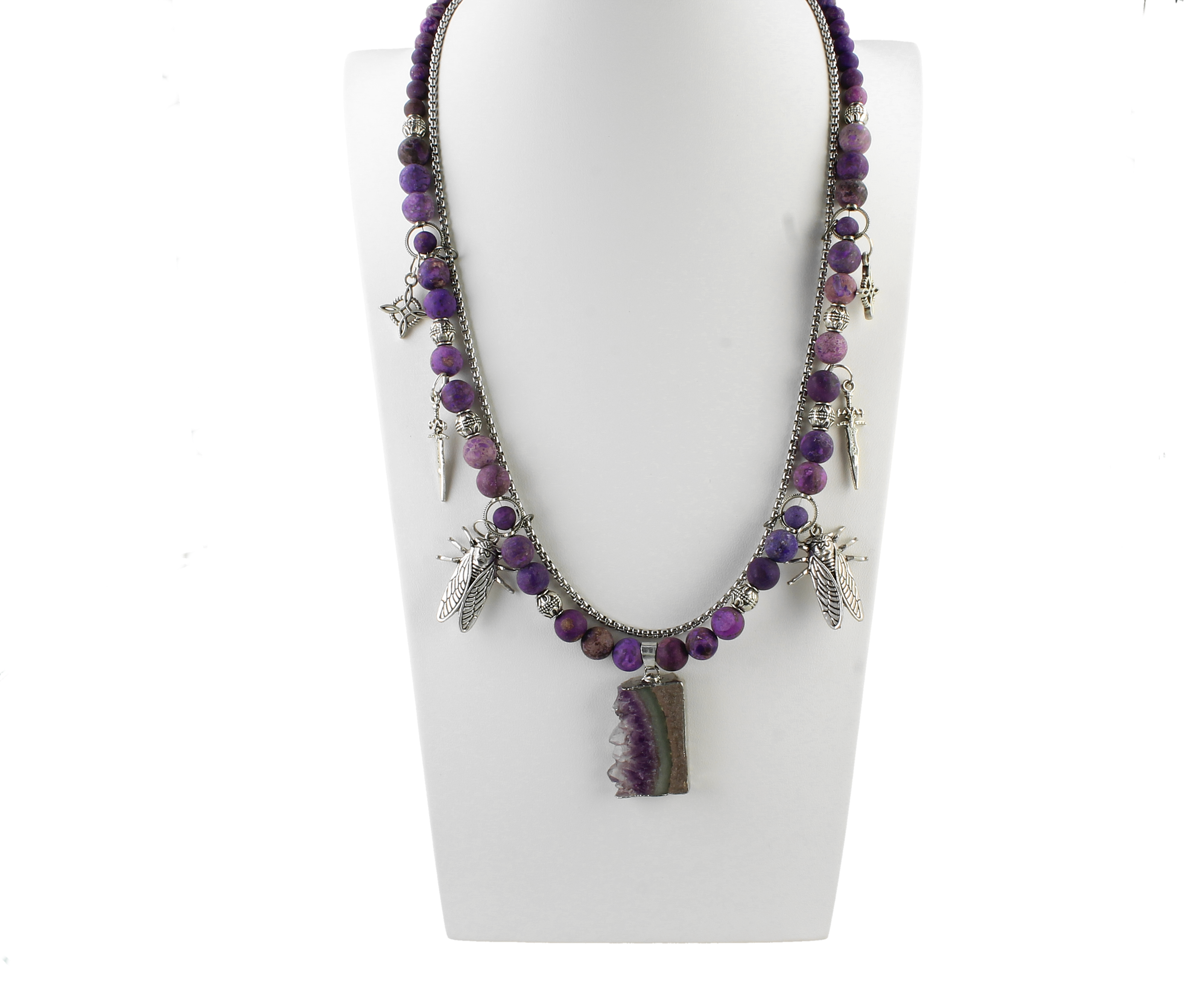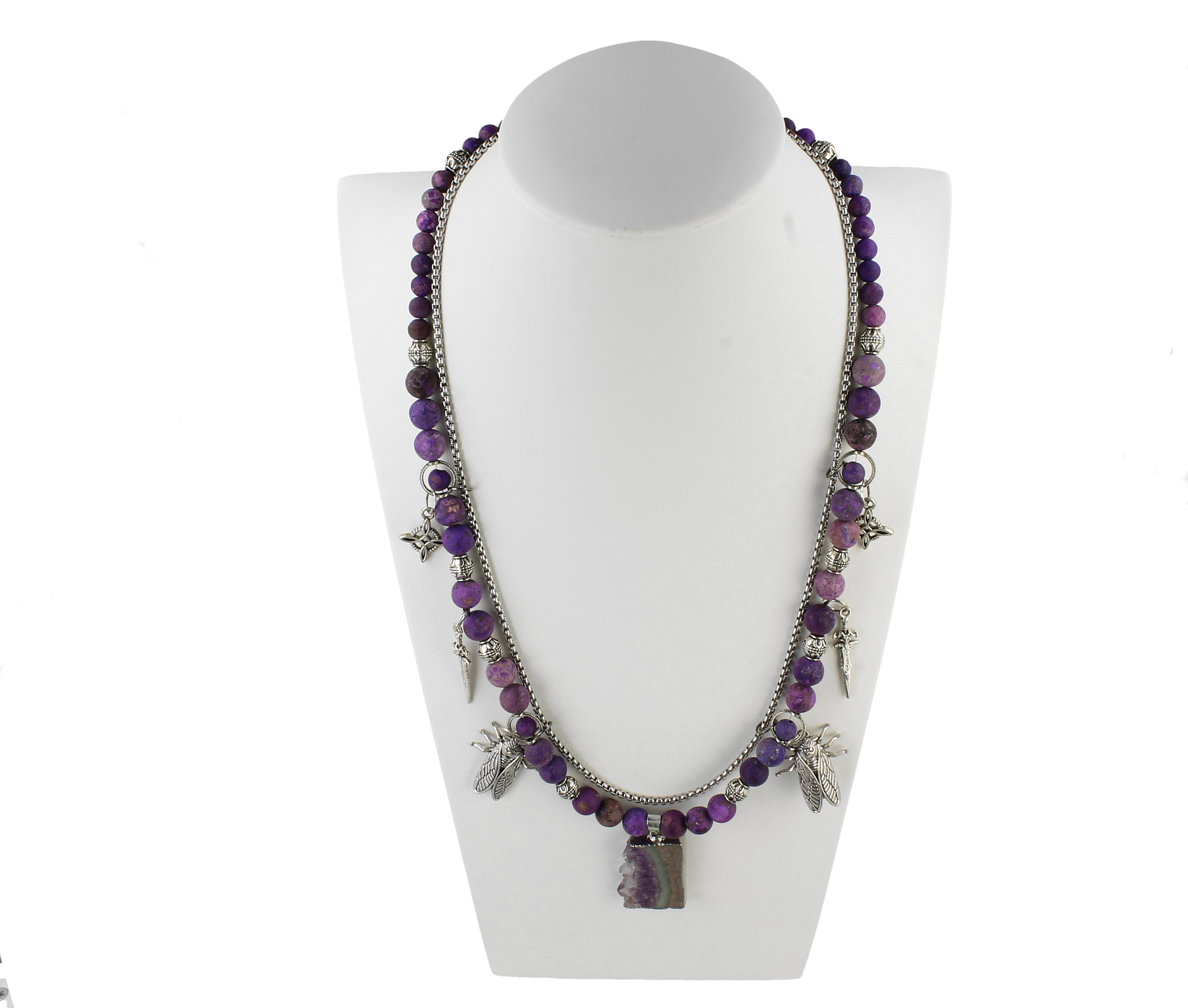 Naszyjnik ręcznie robiony z kamieni naturalnych. Metalowe zawieszki + zawieszka z ametystu. Wykończenia ze stali nierdzewnej.