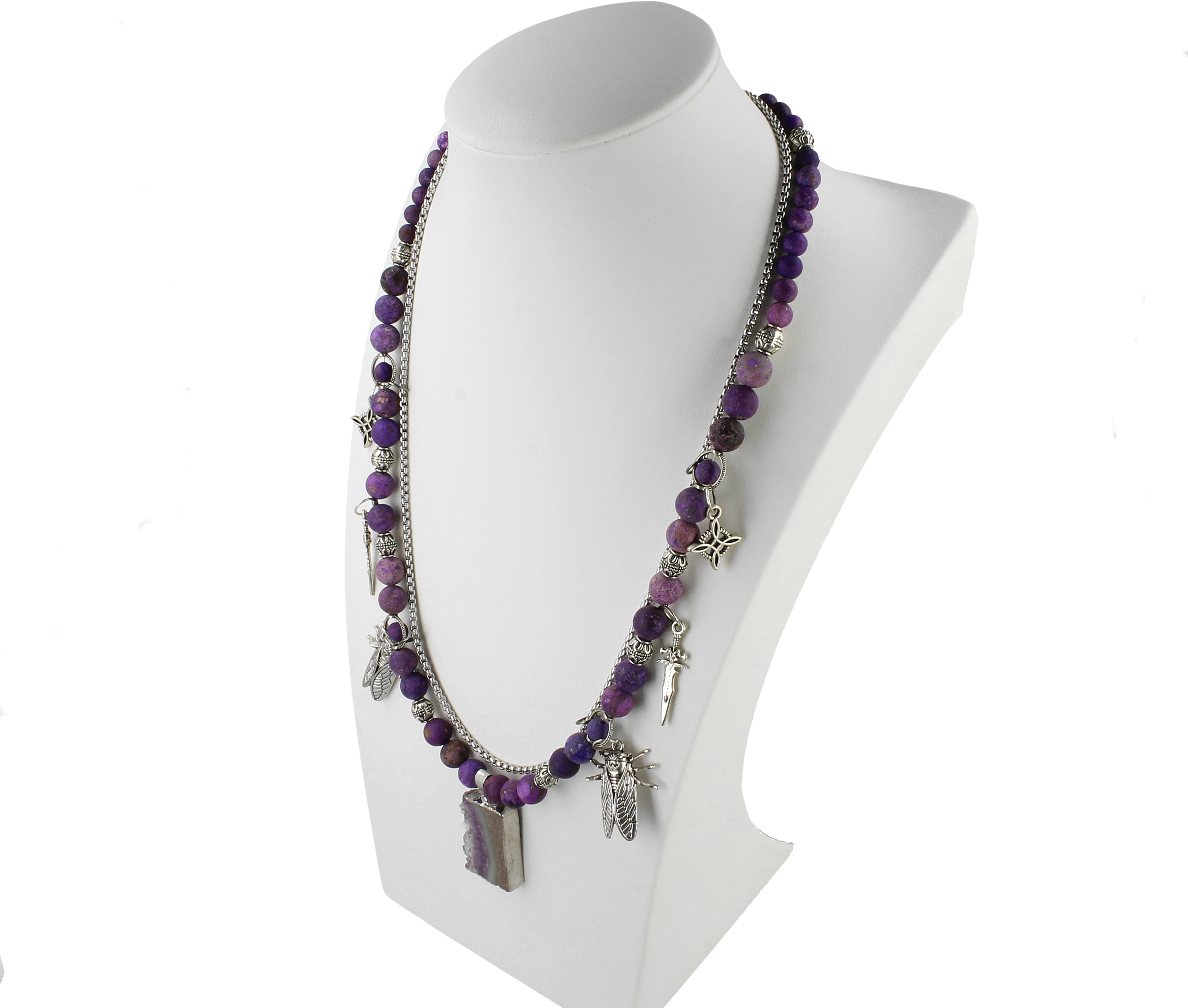 Wyjątkowy, ręcznie wykonany naszyjnik z naturalnego ametystu w głębokich odcieniach fioletu. Biżuteria łączy klasyczne koraliki z ametystu z ozdobnym łańcuszkiem oraz klimatycznymi zawieszkami (skrzydła/owady, gwiazdki, drobne detale). Całość tworzy piękny, magiczny efekt w stylu boho / witchy / vintage.