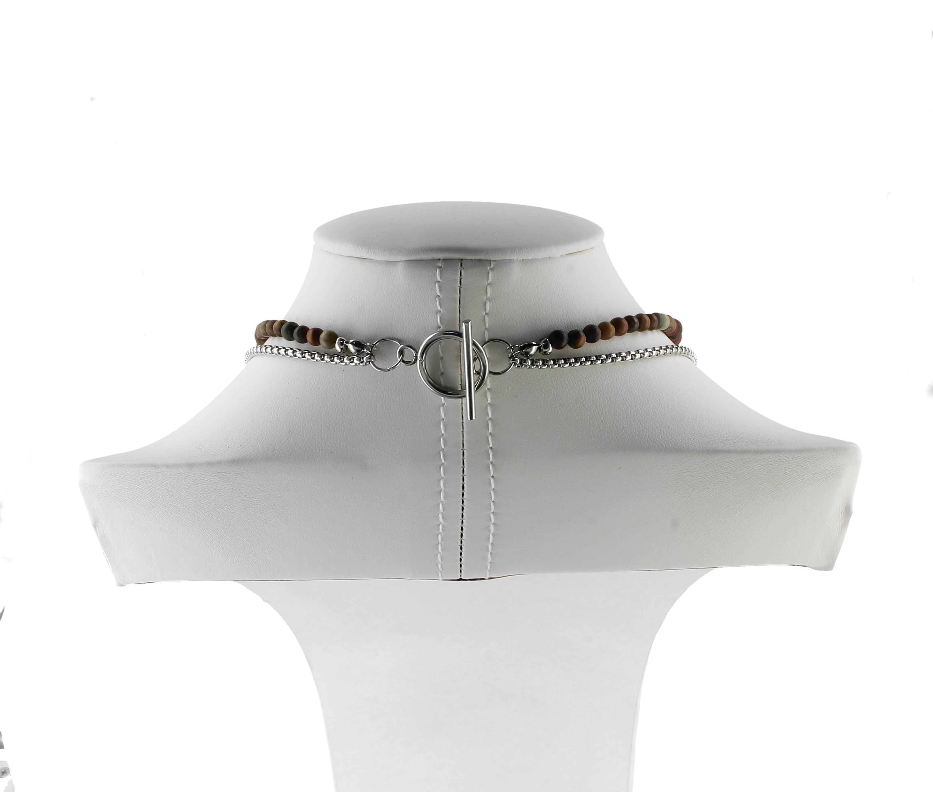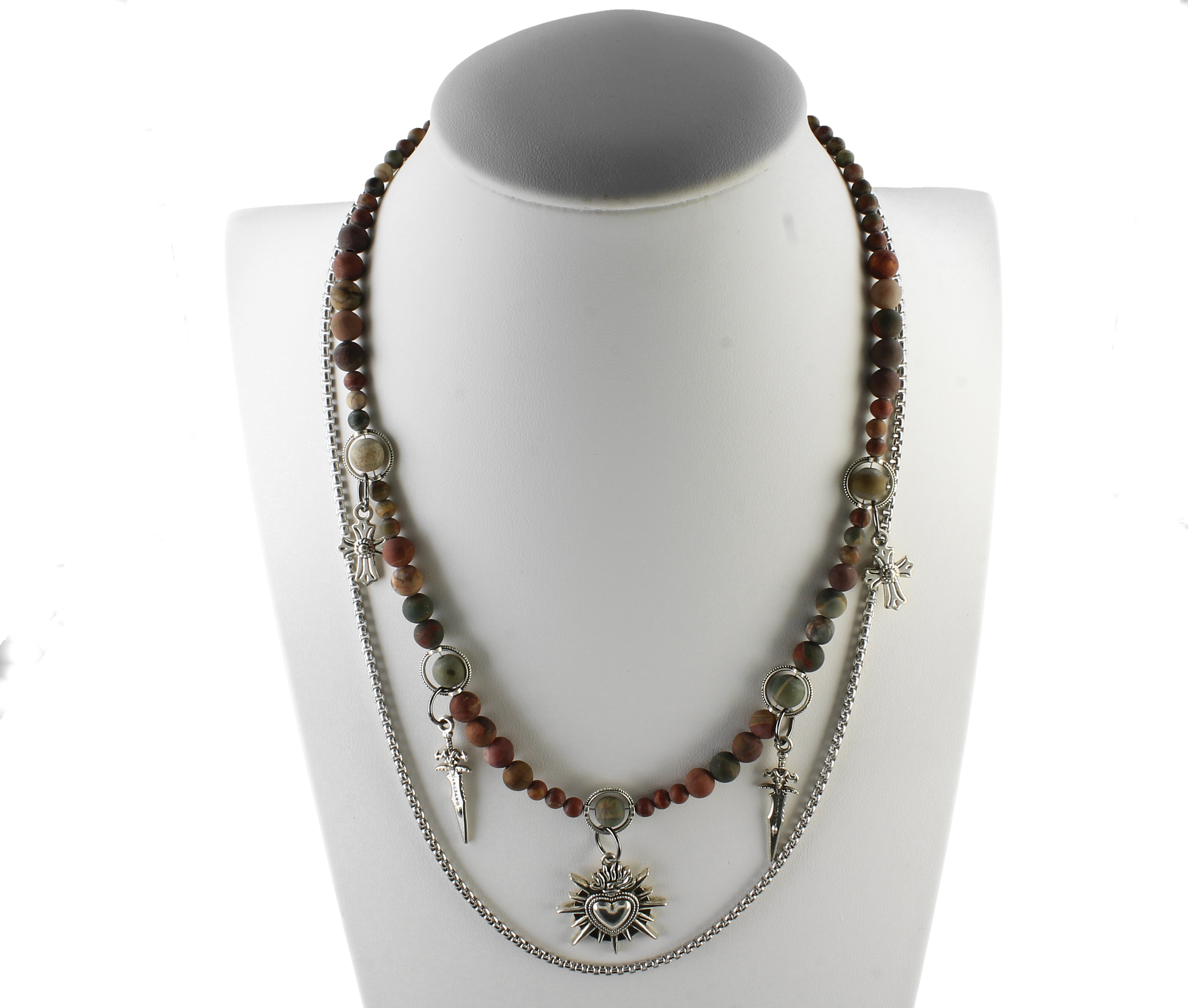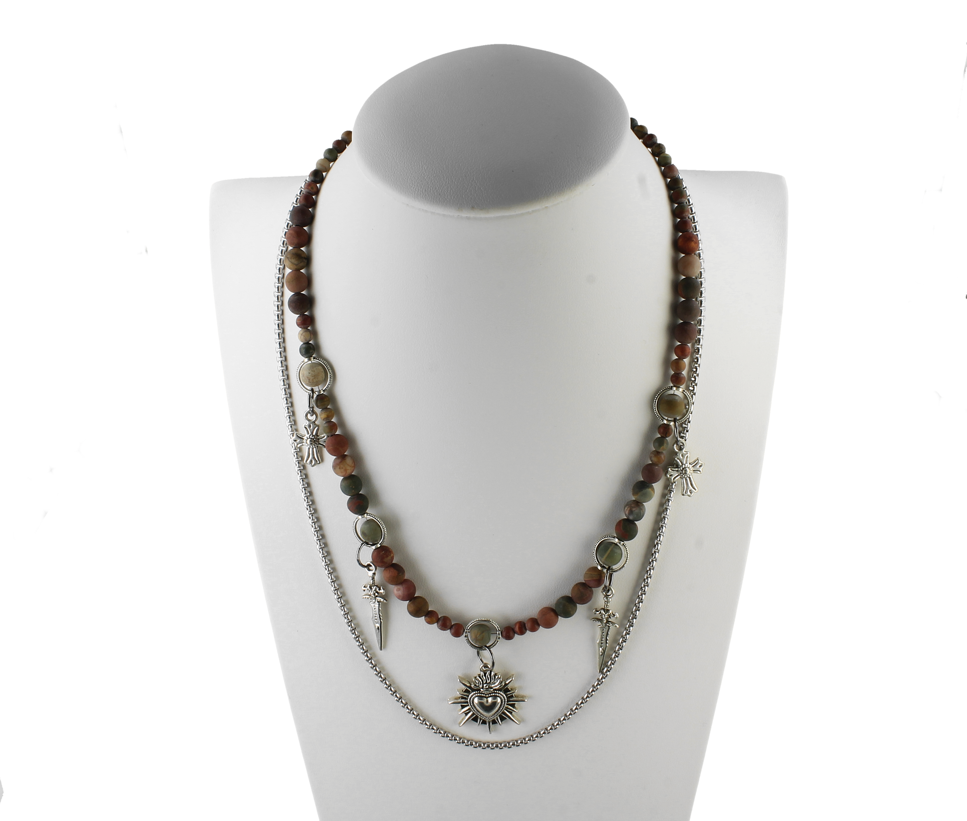 Oryginalny, ręcznie wykonany naszyjnik w odcieniach ziemi – brązy, zielenie i beże. Wykonany z naturalnych kamieni (najprawdopodobniej jaspis), ozdobiony srebrnymi elementami i klimatycznymi zawieszkami: mieczami, krzyżami oraz centralnym motywem Sacred Heart / serca w promieniach.
