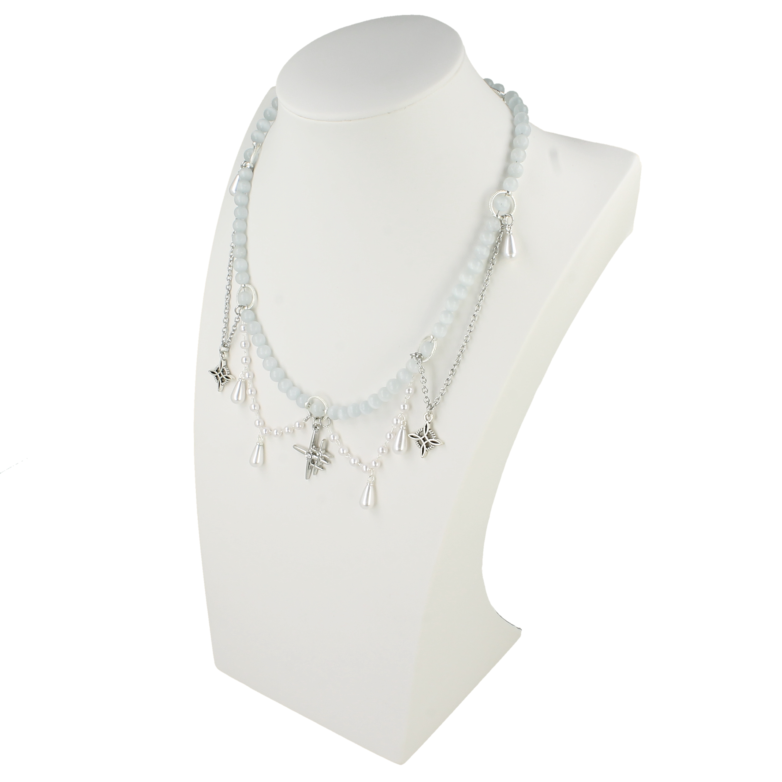 Delikatny, ręcznie wykonany naszyjnik w jasnej, mlecznej kolorystyce. Subtelne koraliki pięknie odbijają światło, a srebrne łańcuszki z drobnymi zawieszkami tworzą efekt lekkiej, romantycznej ozdoby.