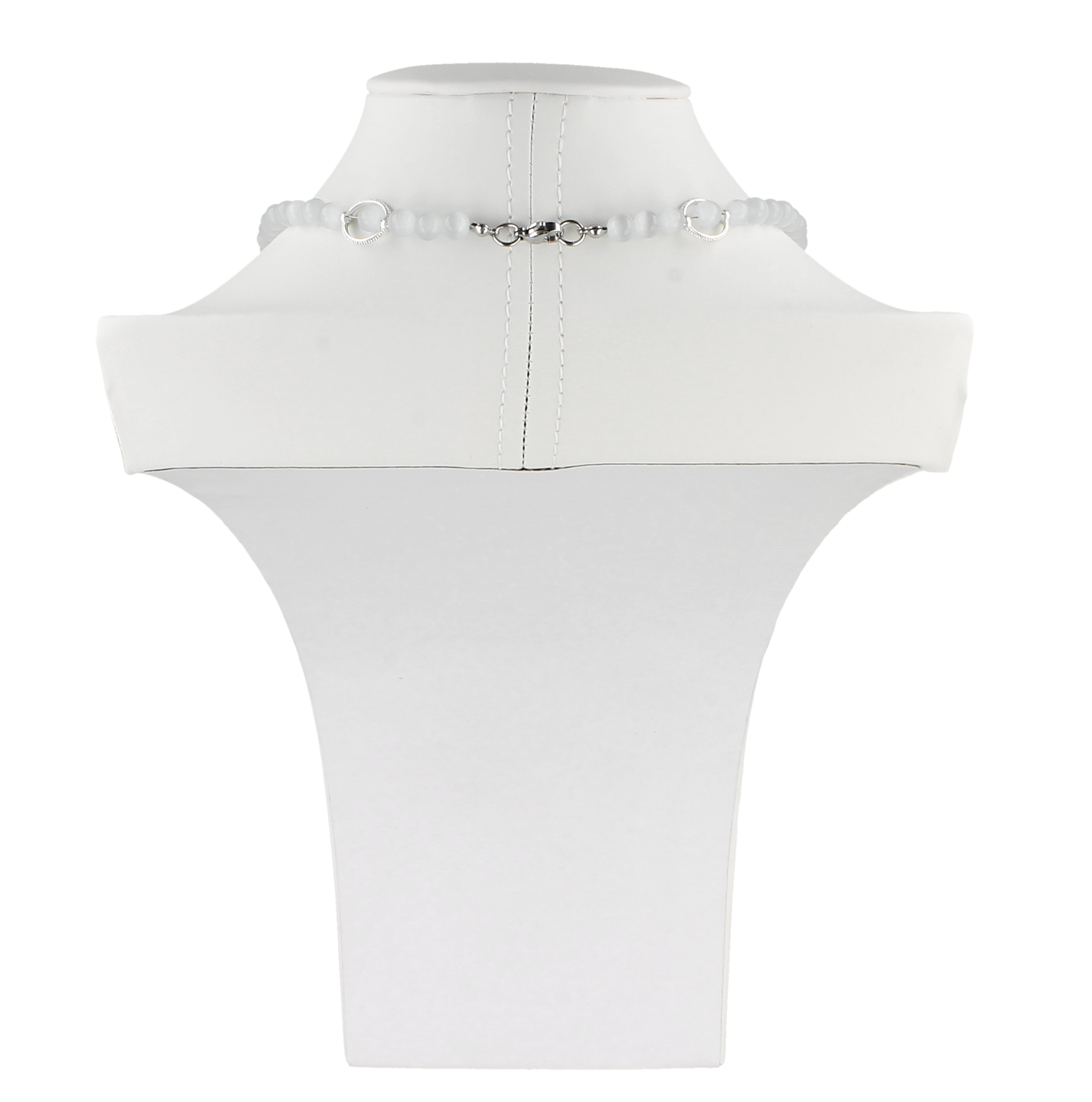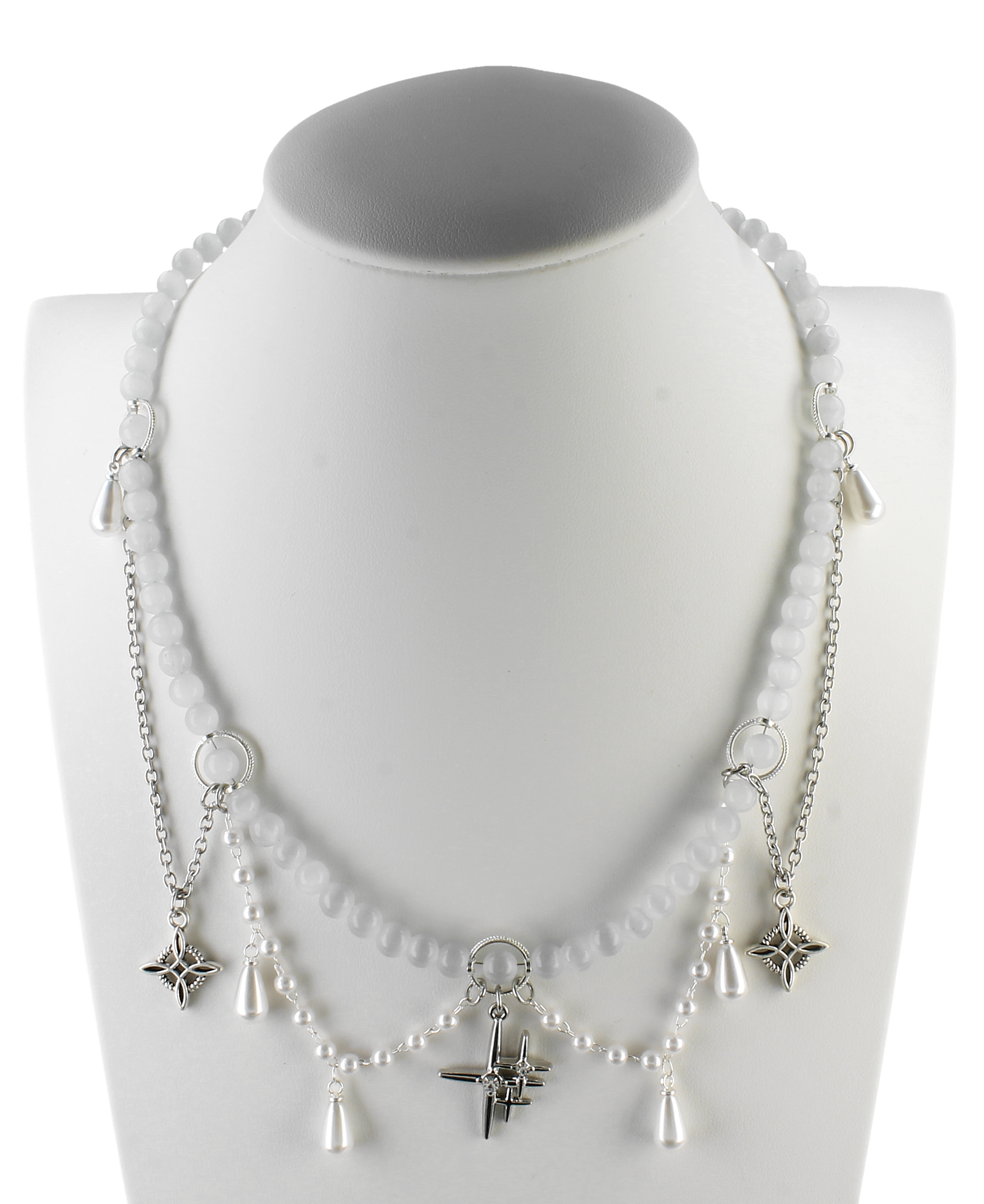 Subtelny, biały naszyjnik handmade, który wygląda jak stworzony z mgły, światła i letniego spokoju. Mleczne koraliki w chłodnym odcieniu bieli pięknie odbijają światło, a srebrne łańcuszki z drobnymi zawieszkami tworzą efekt lekko opadających girland.