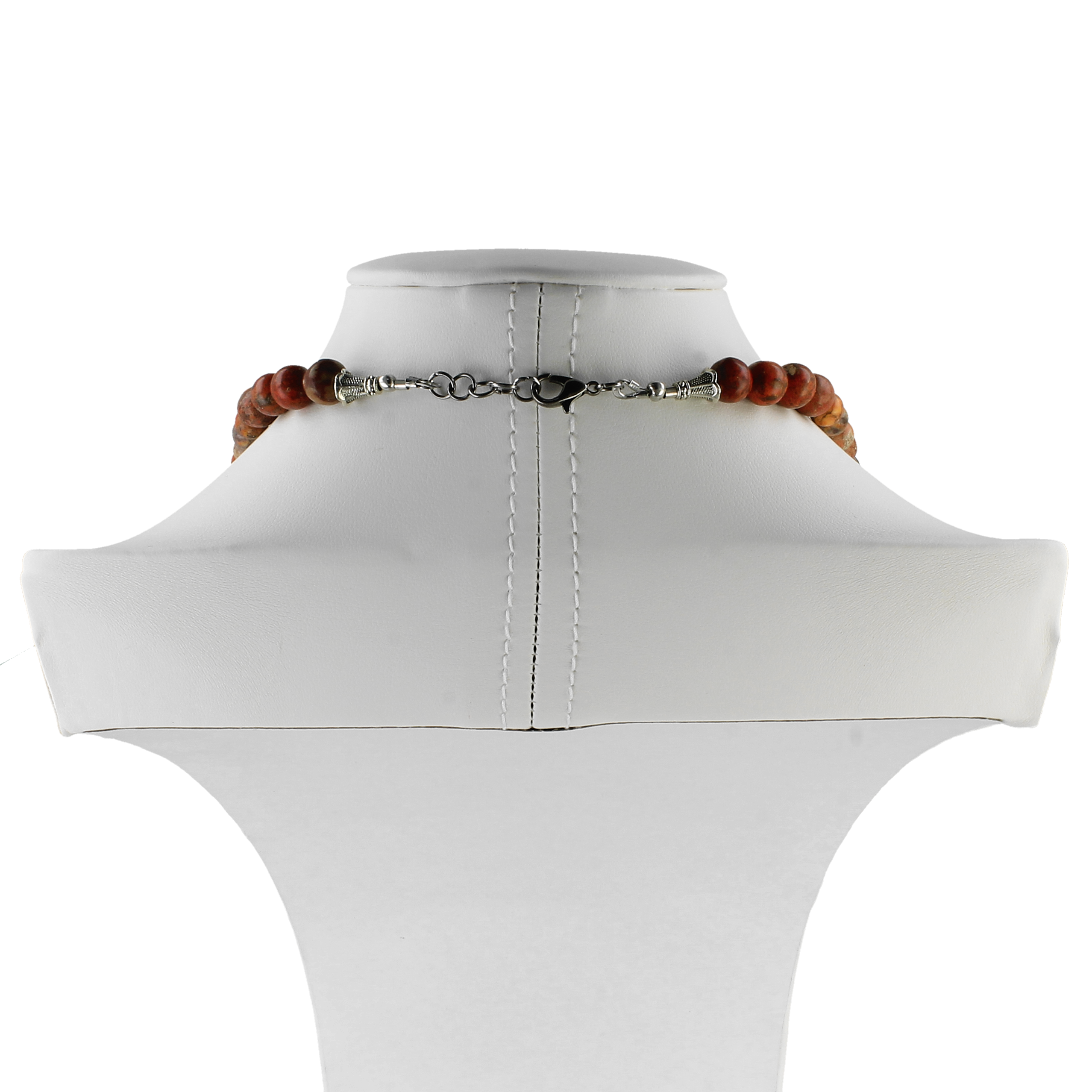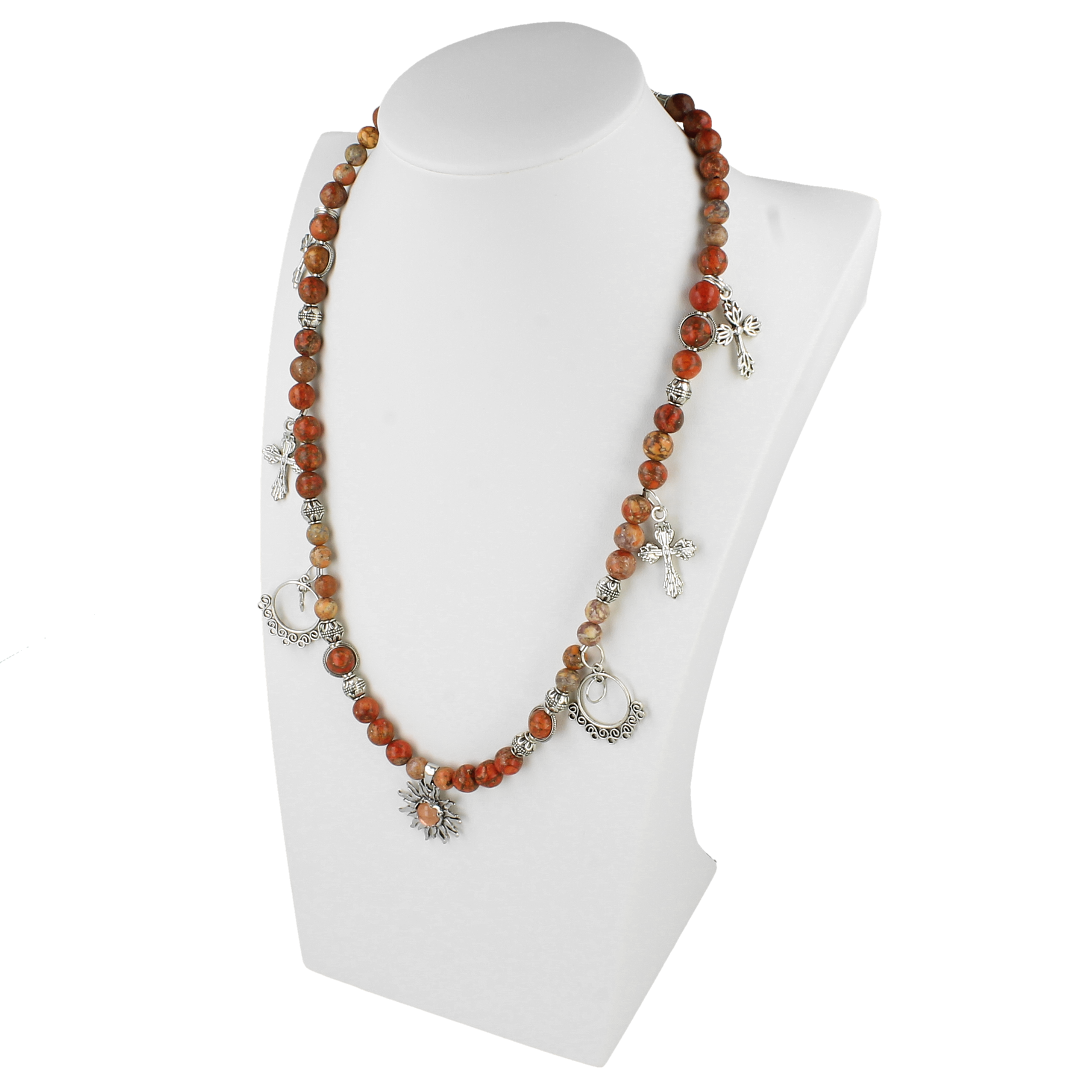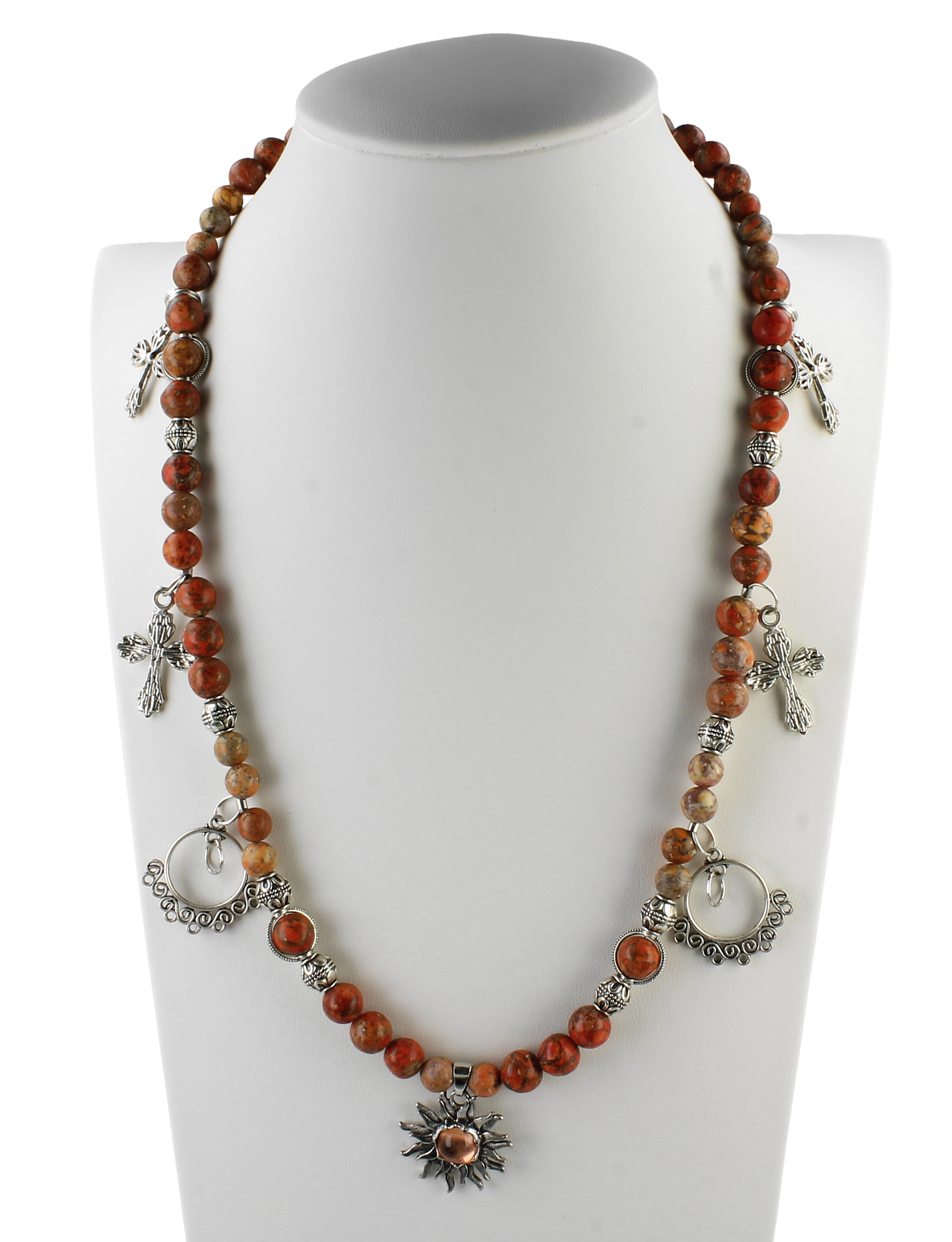 Wyjątkowy, długi naszyjnik wykonany ręcznie z naturalnych kamieni jaspisu w pięknych odcieniach czerwieni, rdzy i beżu. Dodatki w kolorze srebra nadają mu charakteru vintage/boho, a zawieszki w formie krzyży oraz słońca tworzą niepowtarzalny klimat.